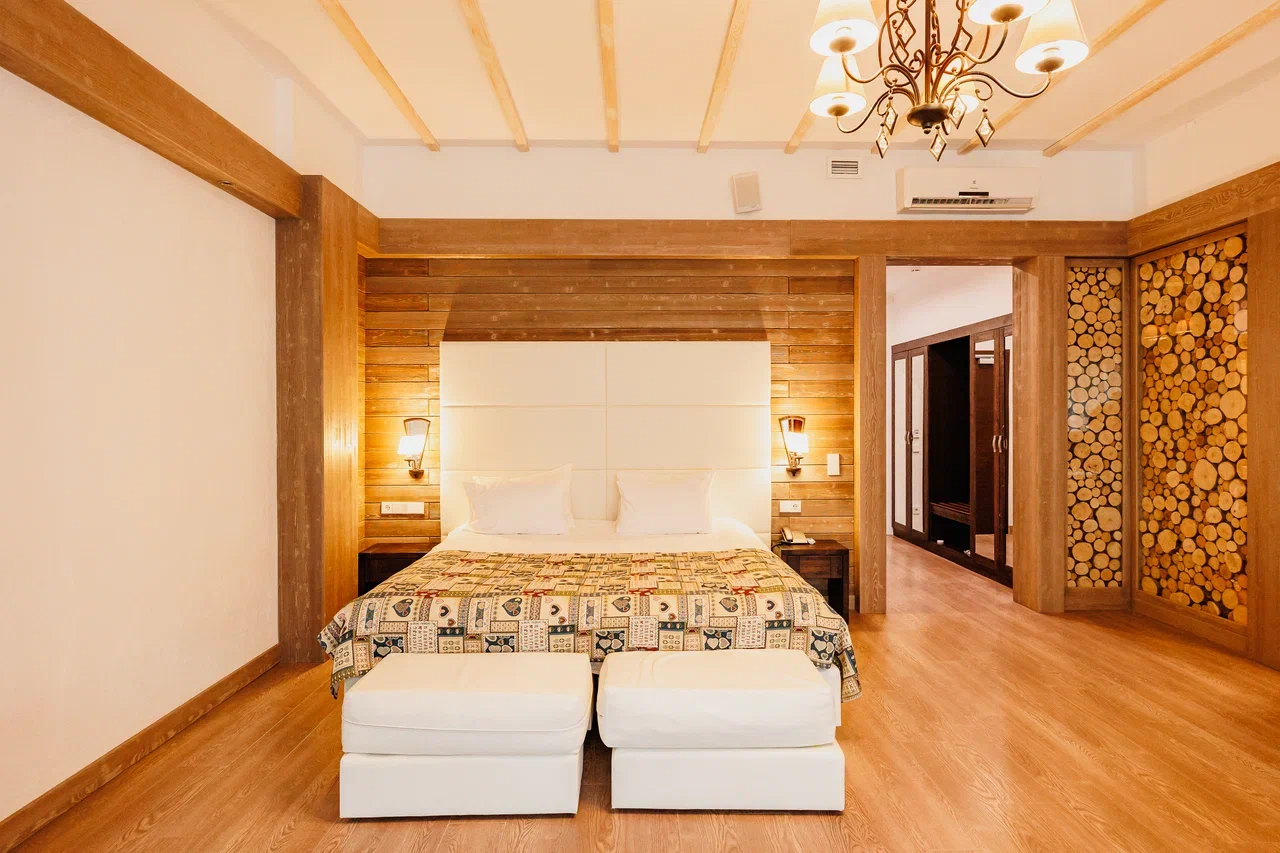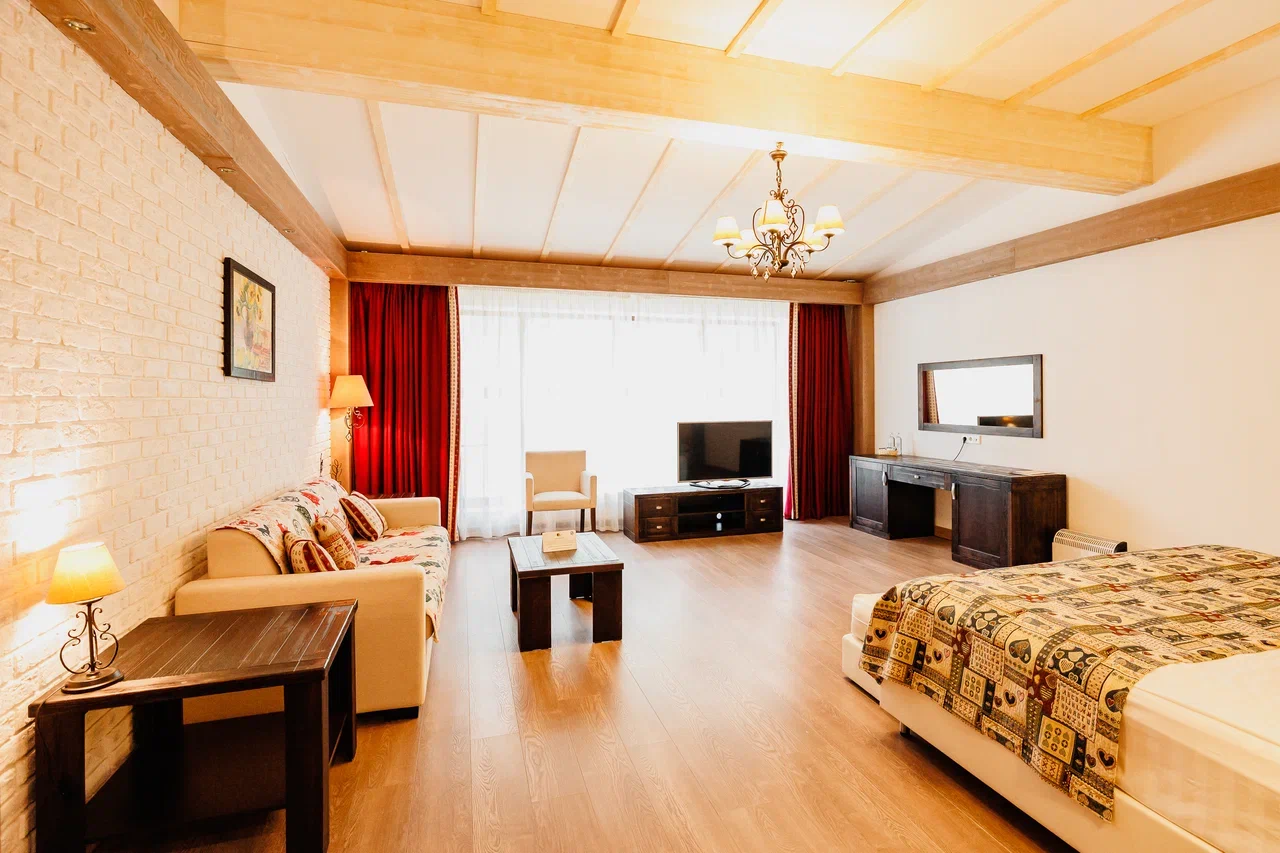 Просторный однокомнатный номер максимум для 3-х гостей занимает площадь в 42 кв. м. Из окон открывается панорамный вид на лес. В номере двуспальная кровать, мягкий уголок, журнальный столик, 2 встроенных шкафа, тумбочки, рабочий стол. Из техники имеется кондиционер, сейф, телефон, телевизор, Wi-Fi. Из удобств - ванная и душевая, предоставляются тапочки, халаты, туалетные принадлежности, фен.